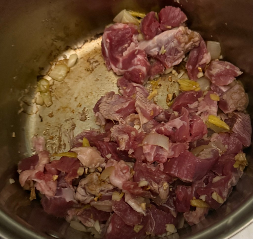 3. Add the pork pieces to the pot, browning them on all sides.