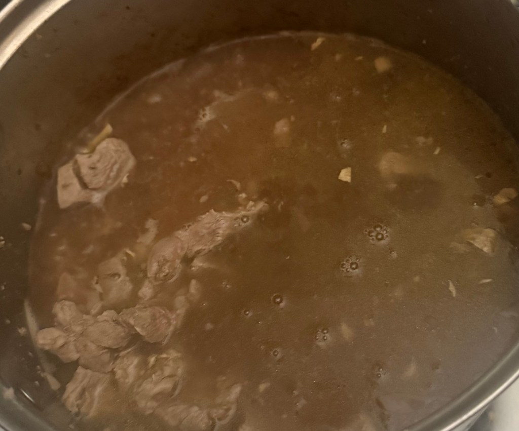 4. Once the pork is browned, pour in the chicken or vegetable broth and bring to a simmer.