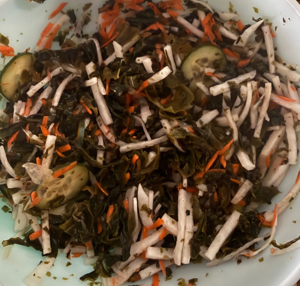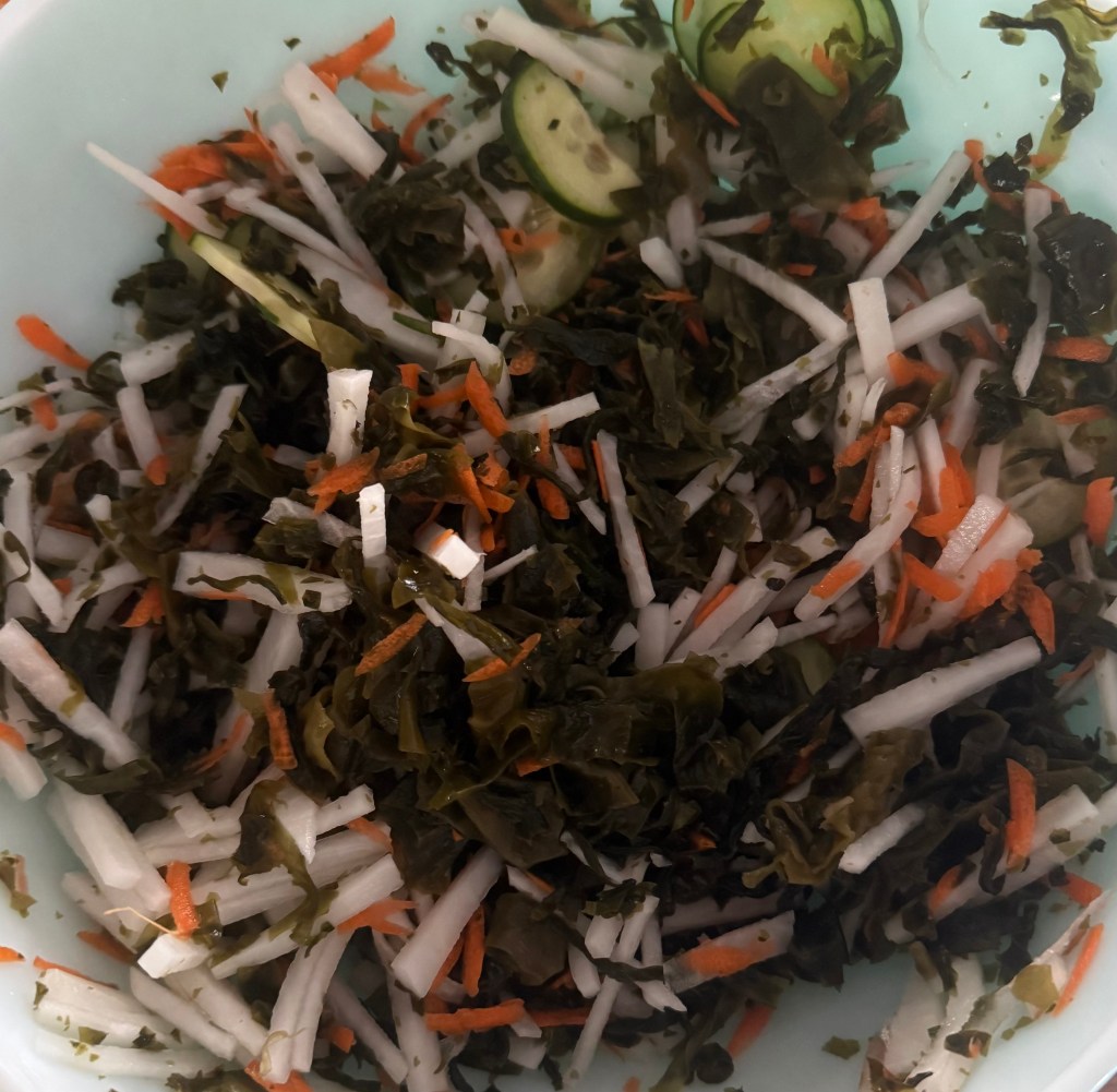 1. In a large mixing bowl, combine the julienned daikon radish, rehydrated seaweed, sliced cucumber, and grated carrots (if using).