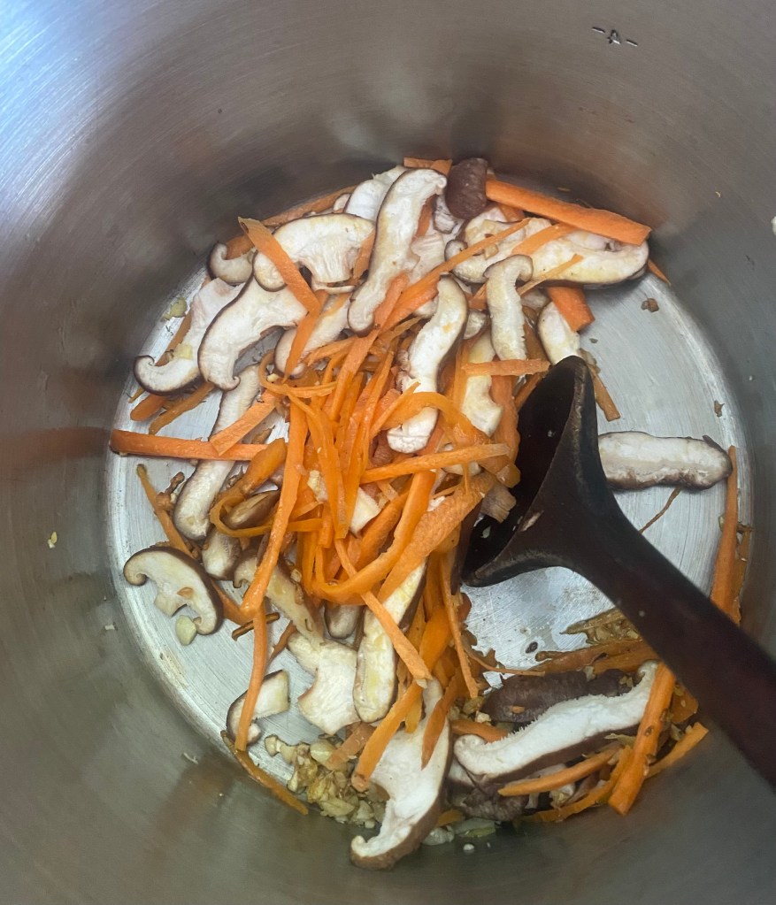 2. Add the sliced mushrooms and julienned carrot to the pot, cooking for another 3-4 minutes until the vegetables begin to soften.