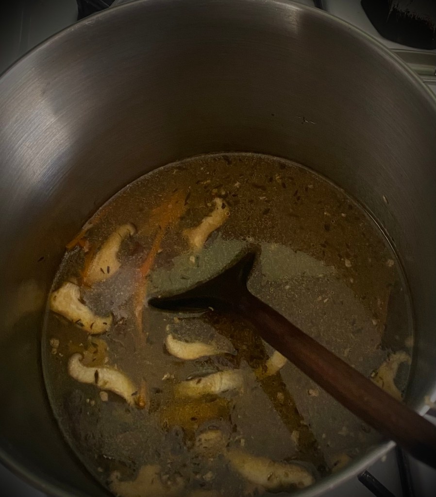 3. Pour in the vegetable or chicken broth and bring to a gentle simmer.