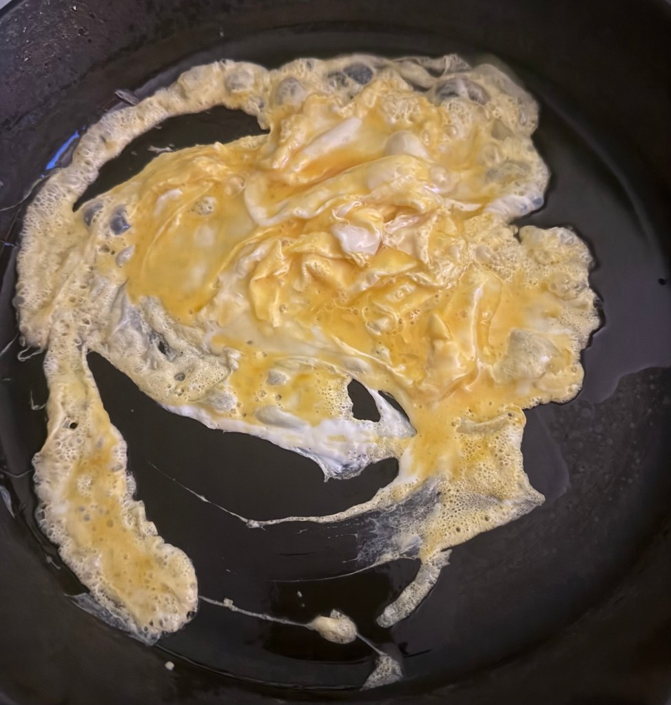 3. Pour the beaten eggs into the skillet and scramble until fully cooked. Remove the eggs from the skillet and set aside.