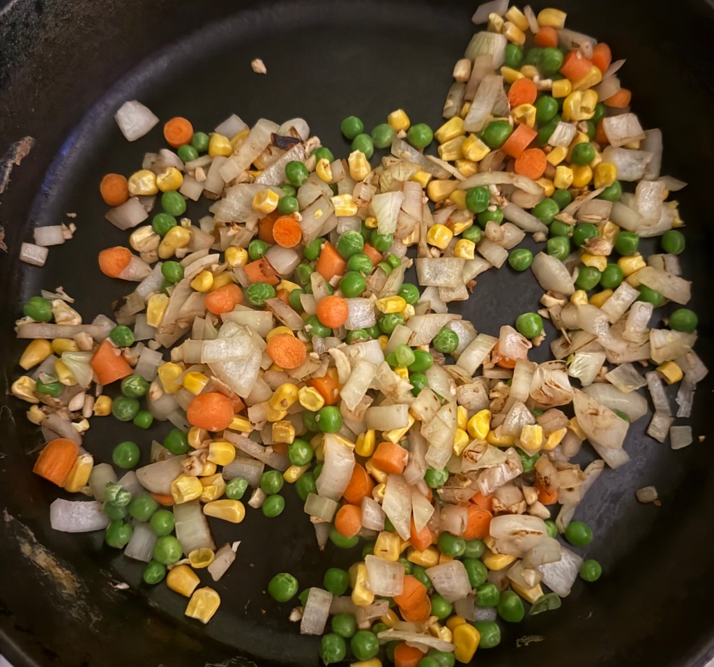 4. In the same skillet, add a bit more oil if needed. Sauté the diced onion and minced garlic for about 2-3 minutes until the onion is translucent. Add the mixed vegetables and cook for another 2-3 minutes until they are heated through.
