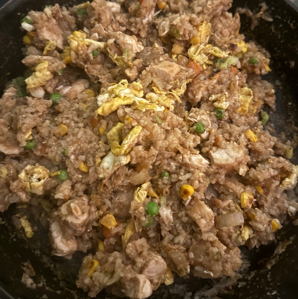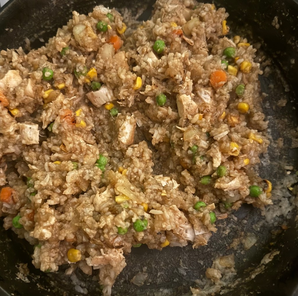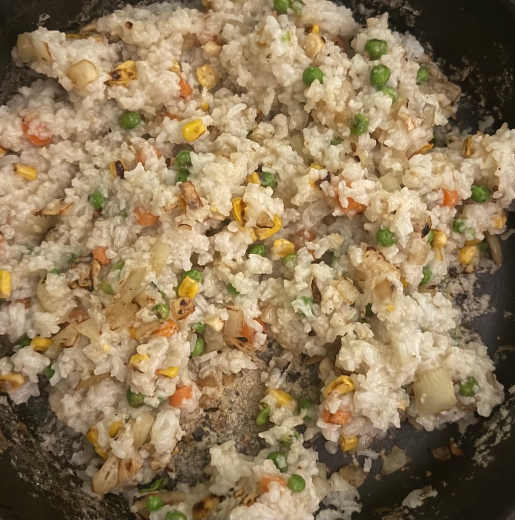 1. If you haven’t already, cook the rice according to package instructions and let it cool. Day-old rice works best as it’s drier and prevents clumping.
