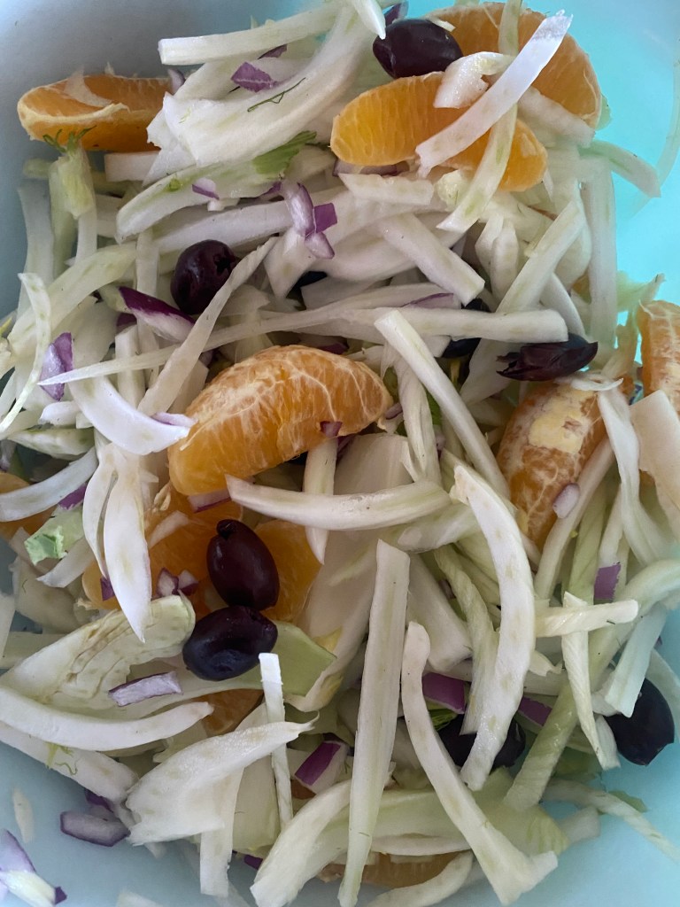 1. In a large mixing bowl, combine the thinly sliced fennel, orange segments, red onion, and olives (if using).