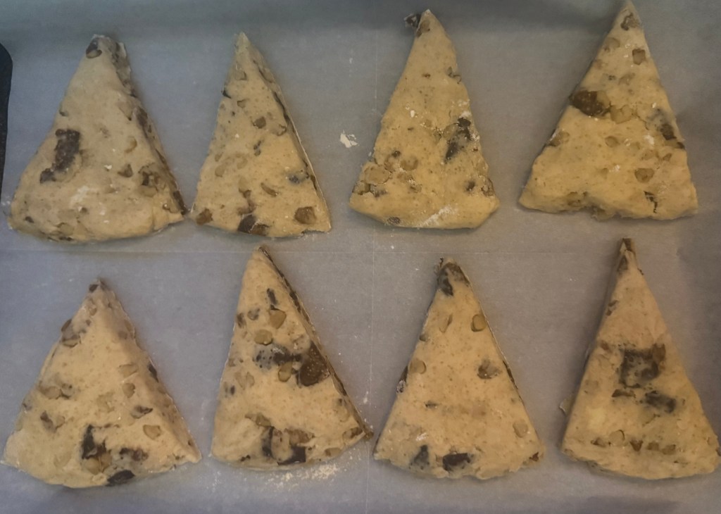 7. Cut the dough into triangles or use a round cutter to cut out scones. Place them on the prepared baking sheet.