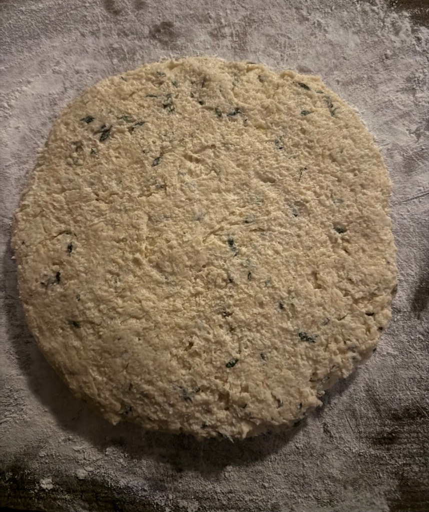 5. Turn the dough out onto a lightly floured surface and knead gently a few times until it comes together. Pat the dough into a circle about 1-inch thick.