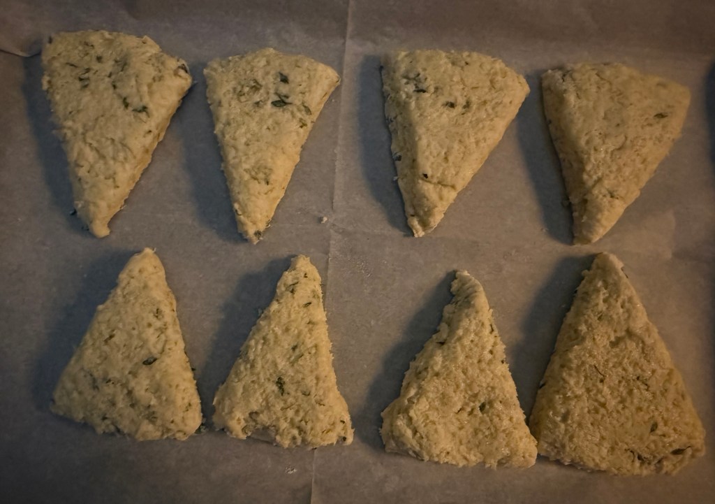 6. Cut the dough into triangles or use a round cutter to cut out scones. Place them on the prepared baking sheet.