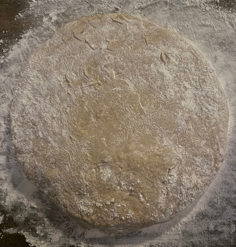 6. Turn the dough out onto a lightly floured surface and knead gently a few times until it comes together. Pat the dough into a circle about 1-inch thick.