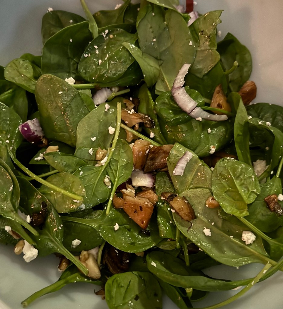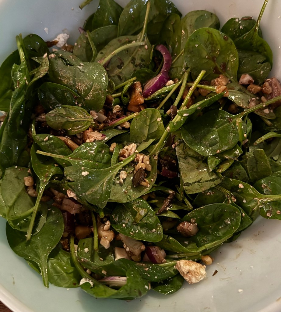 2. In a large mixing bowl, combine the fresh spinach, sautéed mushrooms, red onion, feta, and toasted nuts (if using).