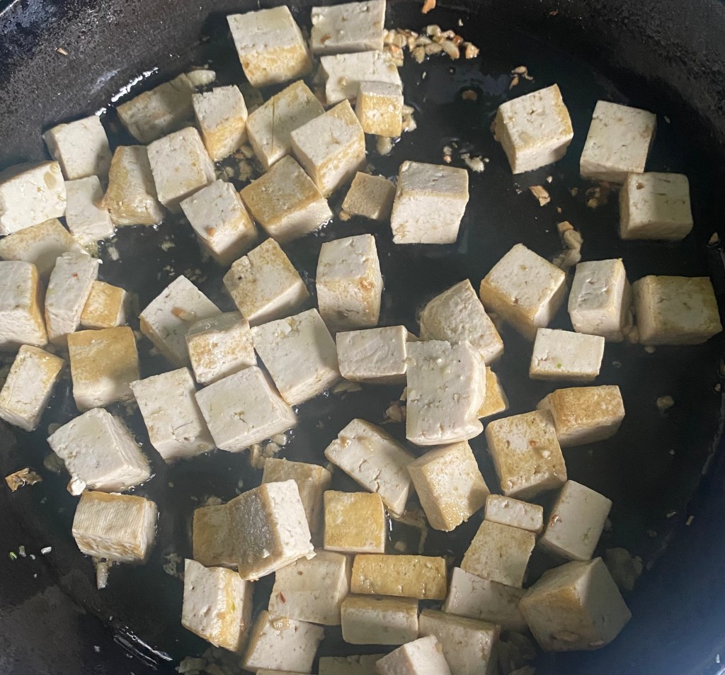 4. Add the cubed tofu (or shrimp/chicken) to the skillet and cook until browned and cooked through.