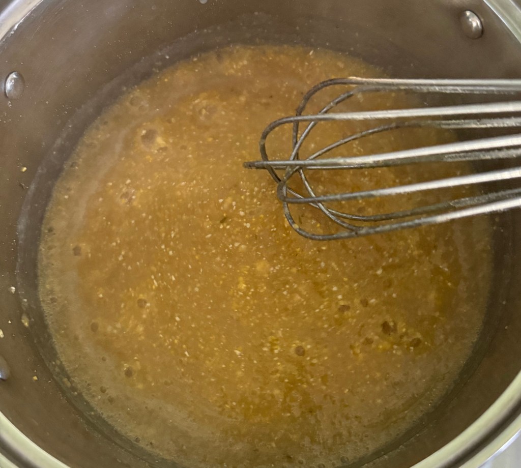 2. Gradually whisk in the cornmeal or polenta, stirring continuously to prevent lumps.
