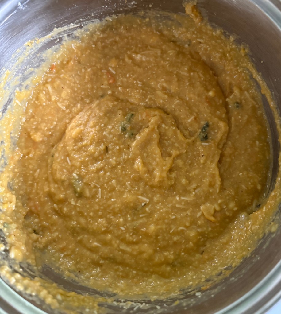 4. Stir in the pumpkin puree, butter or olive oil, chopped sage, and grated Parmesan cheese (if using). Mix well until everything is combined and creamy.