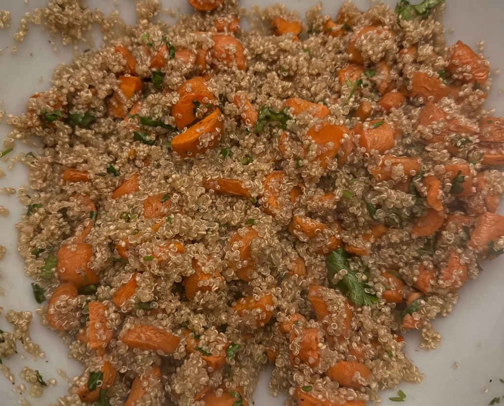 3. In a large mixing bowl, combine the roasted carrots, cooked quinoa, chopped parsley, and dried cranberries or raisins (if using).