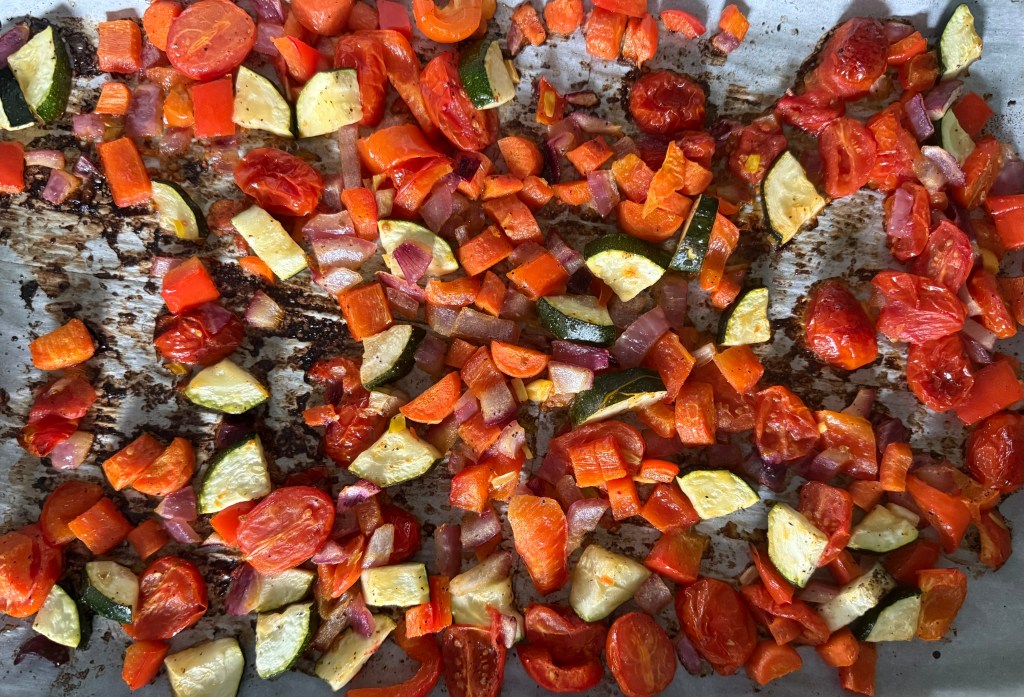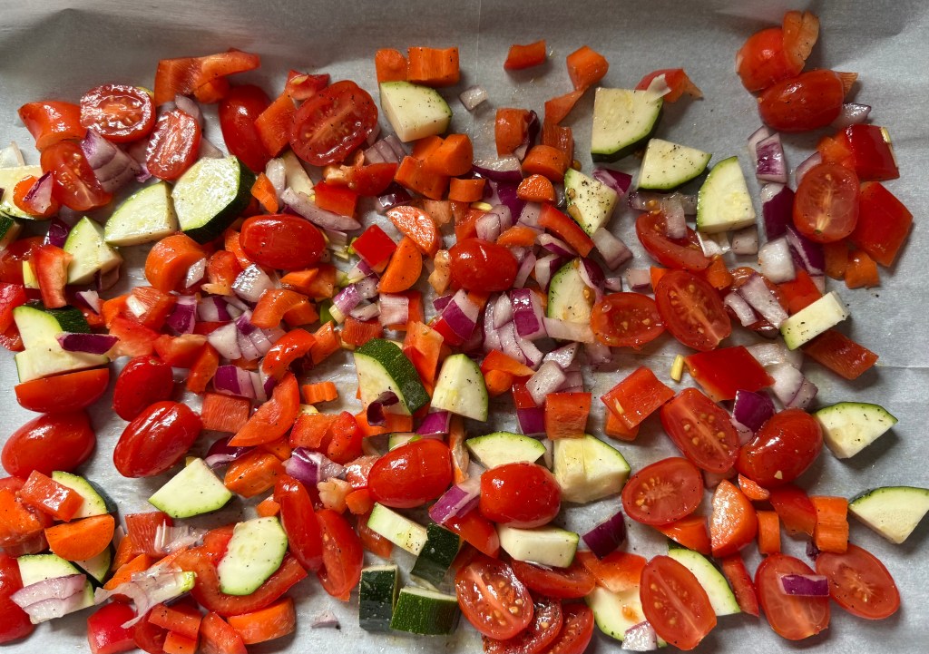 1. Preheat your oven to 425°F (220°C). Toss the chopped mixed vegetables and cherry tomatoes with olive oil, salt, and pepper on a baking sheet. Roast for about 20-25 minutes, or until the vegetables are tender and caramelized. Let them cool slightly.