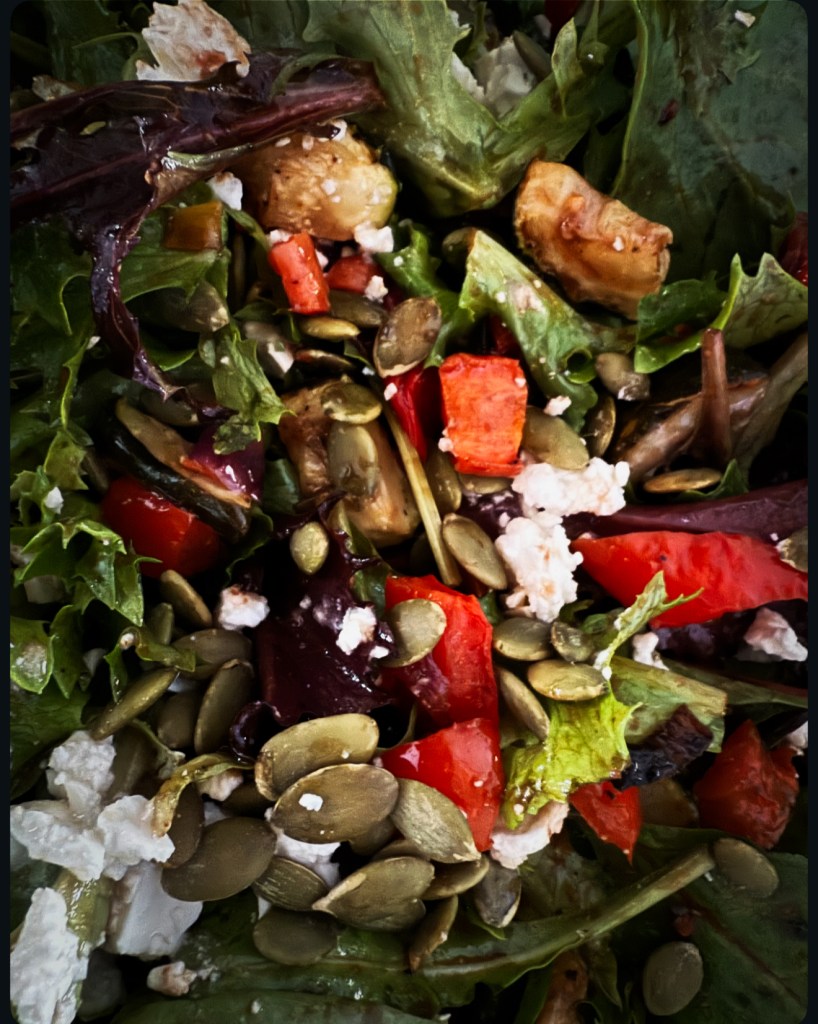 2. In a large mixing bowl, combine the roasted vegetables with the mixed greens.