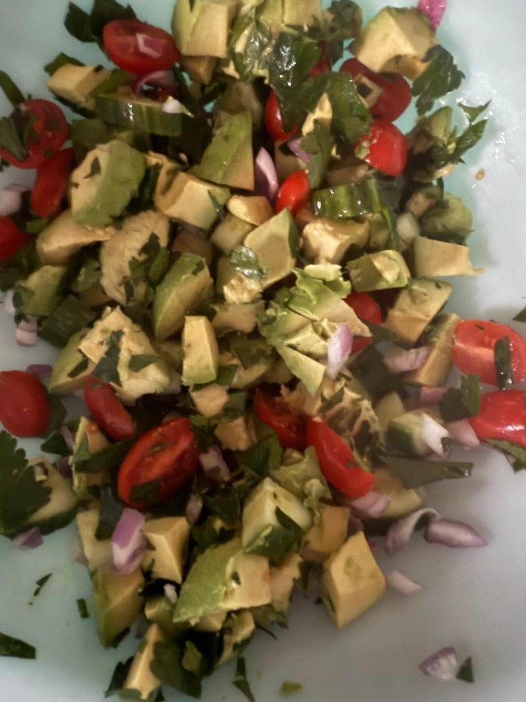 2. In a large mixing bowl, combine the diced avocados, cherry tomatoes, cucumber, red onion, and chopped herbs.