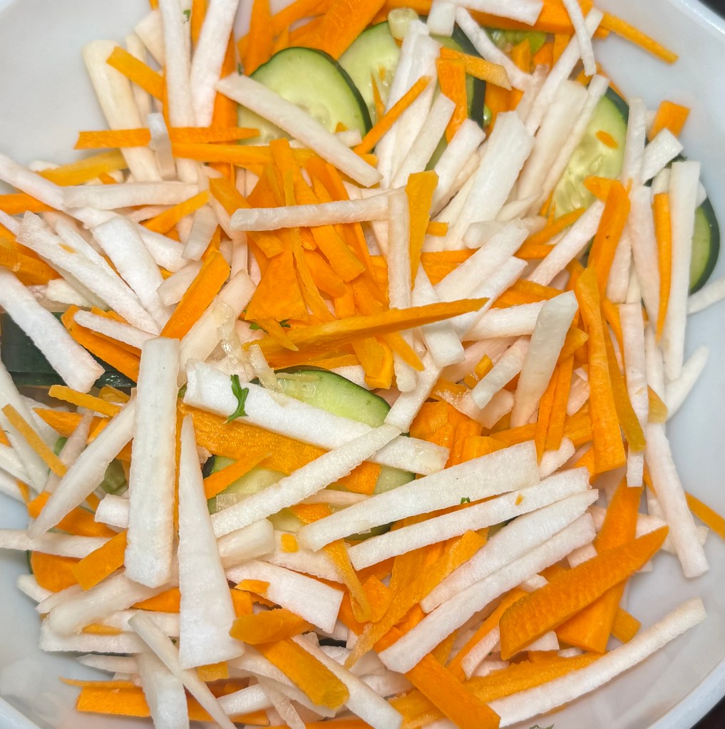 1. In a large mixing bowl, combine the julienned daikon radish, carrots, cucumber, and chopped green onions.