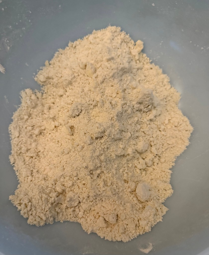 3. Add the cold, cubed butter to the flour mixture and use a pastry cutter or your fingers to blend until the mixture resembles coarse crumbs.
