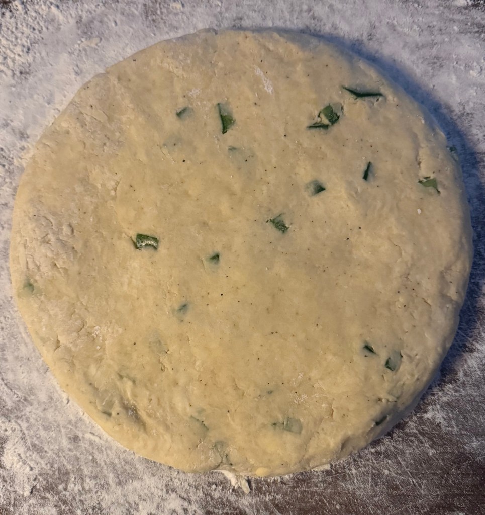 7. Cut the dough into triangles or use a round cutter to cut out scones. Place them on the prepared baking sheet.