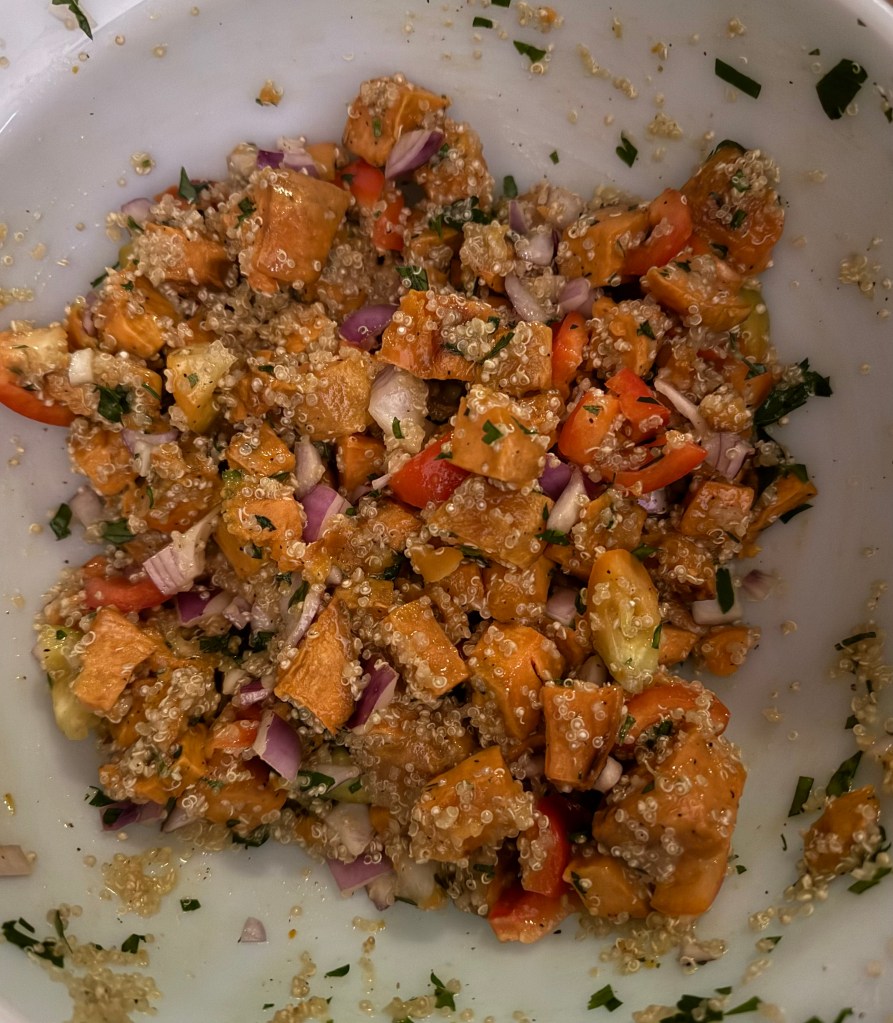 2. In a large mixing bowl, combine the roasted sweet potatoes, cooked quinoa (if using), red bell pepper, red onion, and chopped herbs.