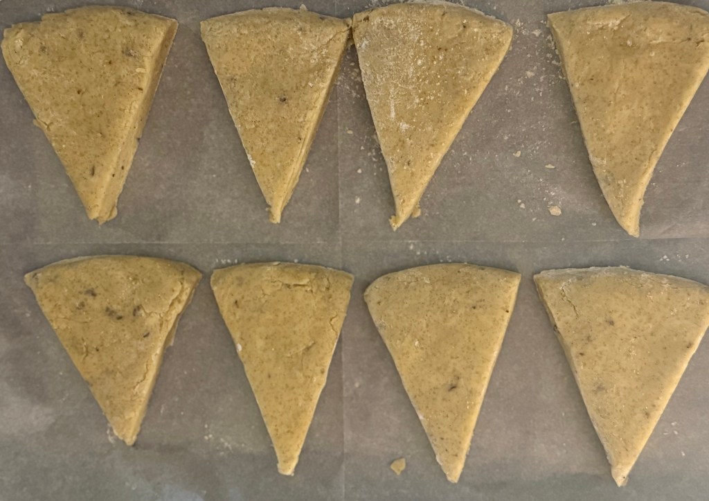 6. Cut the dough into triangles or use a round cutter to cut out scones. Place them on the prepared baking sheet.