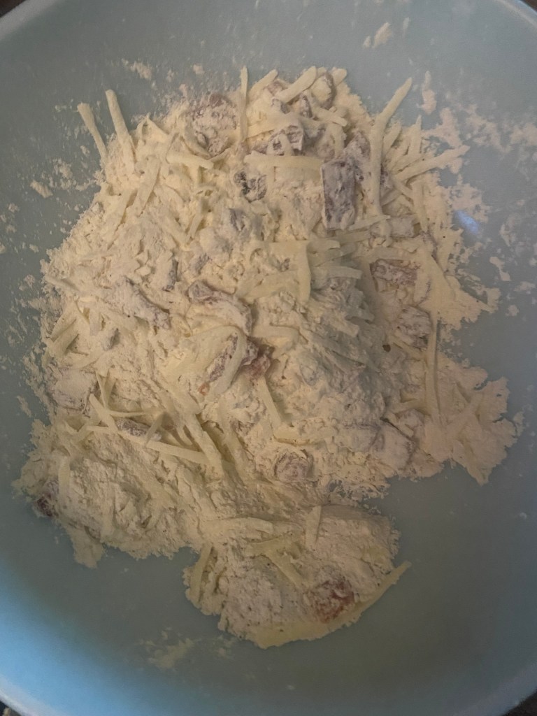 3. Stir in the shredded cheddar cheese and crumbled bacon until evenly distributed.