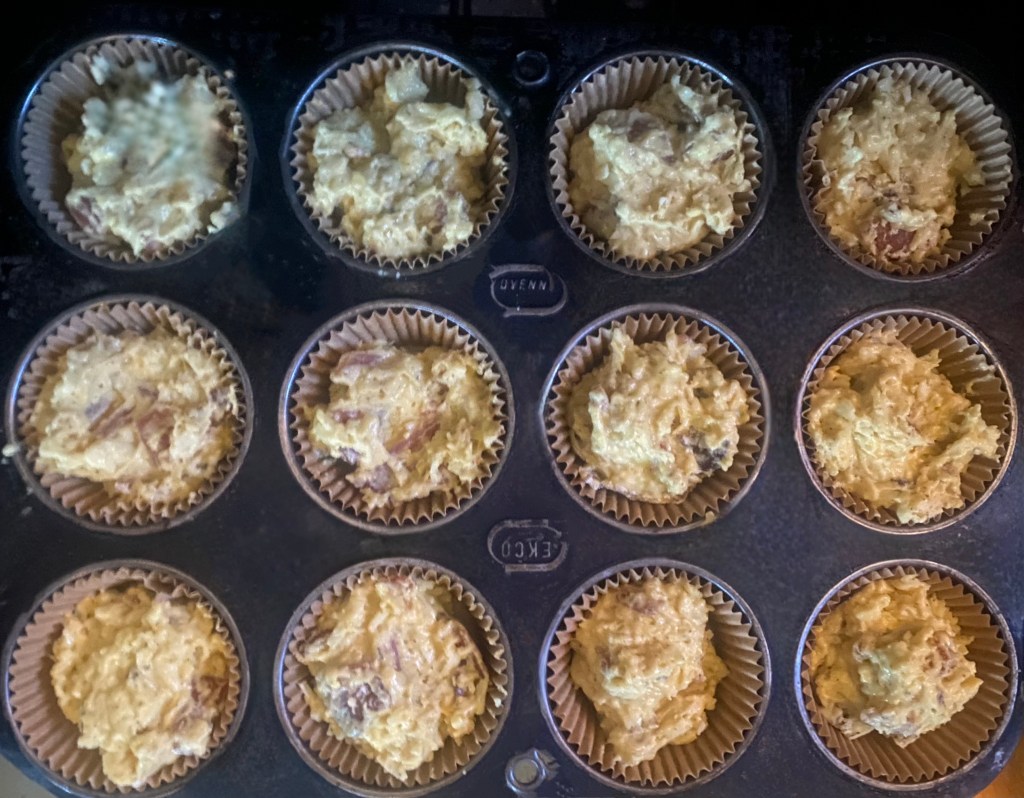 6. Divide the batter evenly among the muffin cups, filling each about 2/3 full.