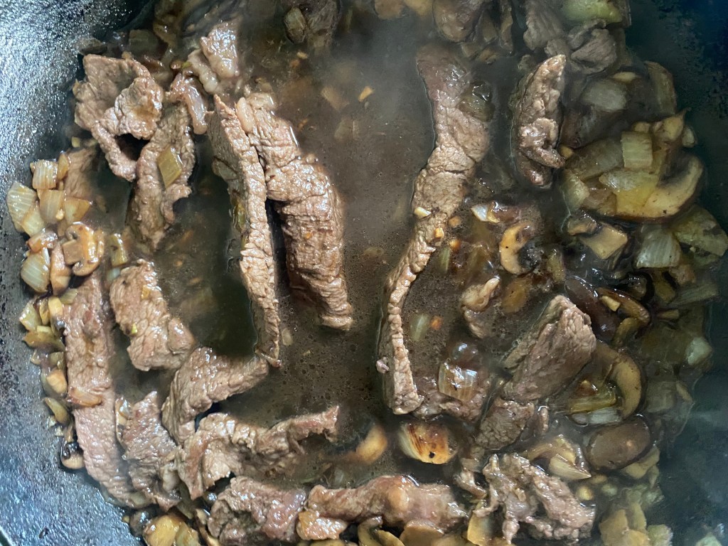 1. In a large skillet, heat the olive oil over medium-high heat and add the sliced beef.