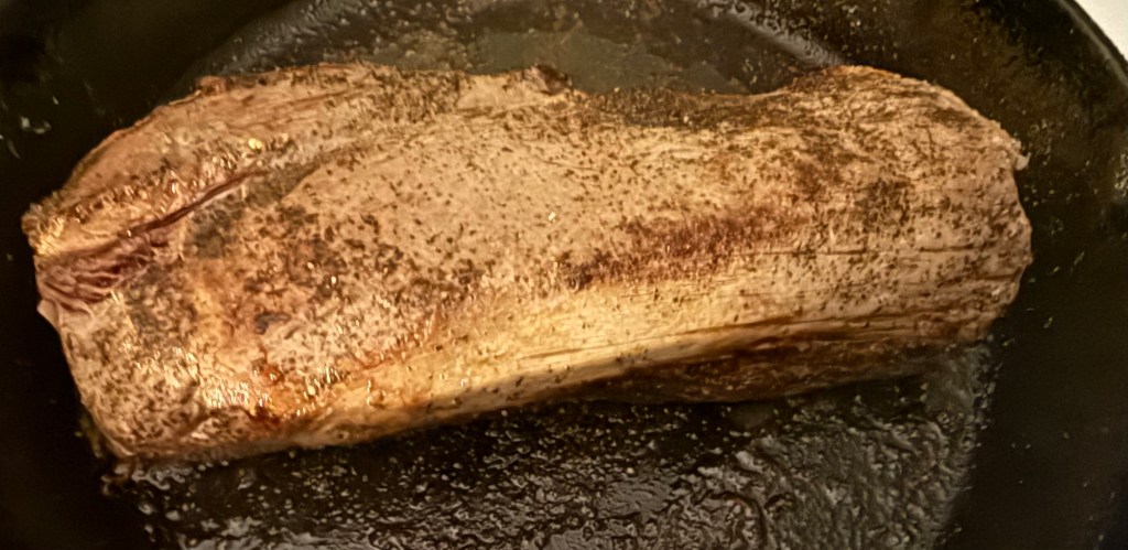 2. Season the beef tenderloin with salt and pepper. In a large skillet, heat the olive oil over high heat and sear the beef on all sides until browned. Remove from heat and let it cool.