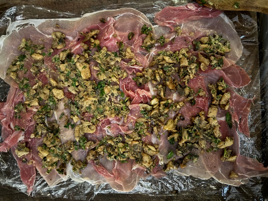 4. Lay out the slices of prosciutto on a sheet of plastic wrap, slightly overlapping. Spread the mushroom mixture over the prosciutto.