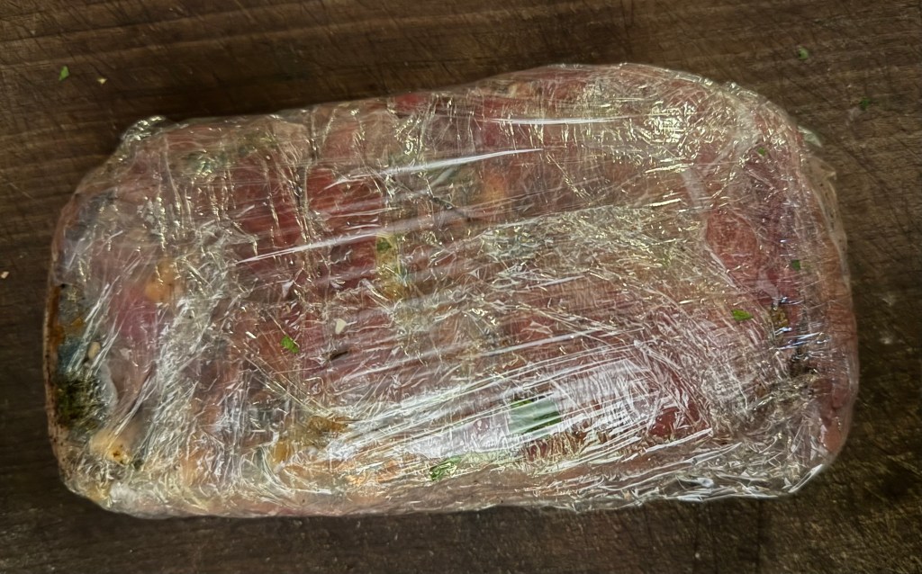 5. Place the cooled beef in the center and roll it tightly using the plastic wrap. Refrigerate for 15 minutes to firm up.
