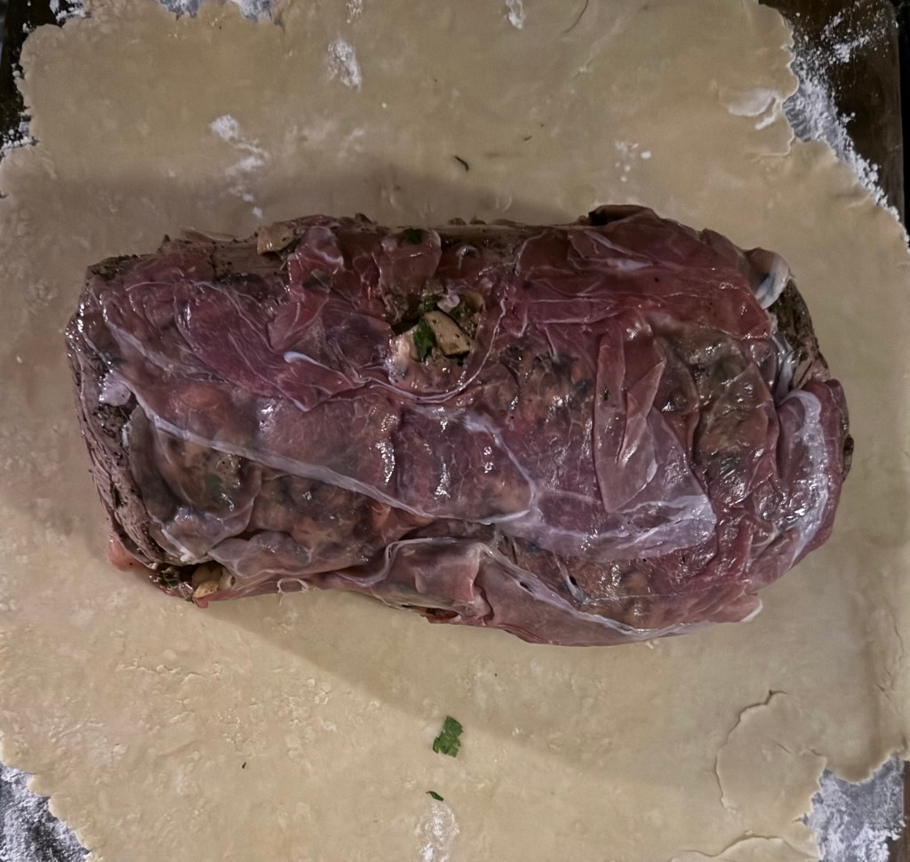 6. Roll out the puff pastry on a floured surface and unwrap the beef from the plastic. Place the beef in the center of the pastry and wrap it tightly, sealing the edges.