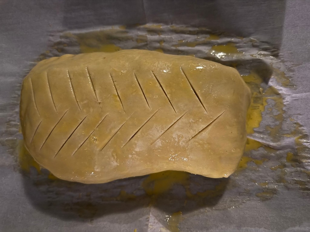 7. Brush the pastry with the beaten egg and cut slits on top for ventilation.