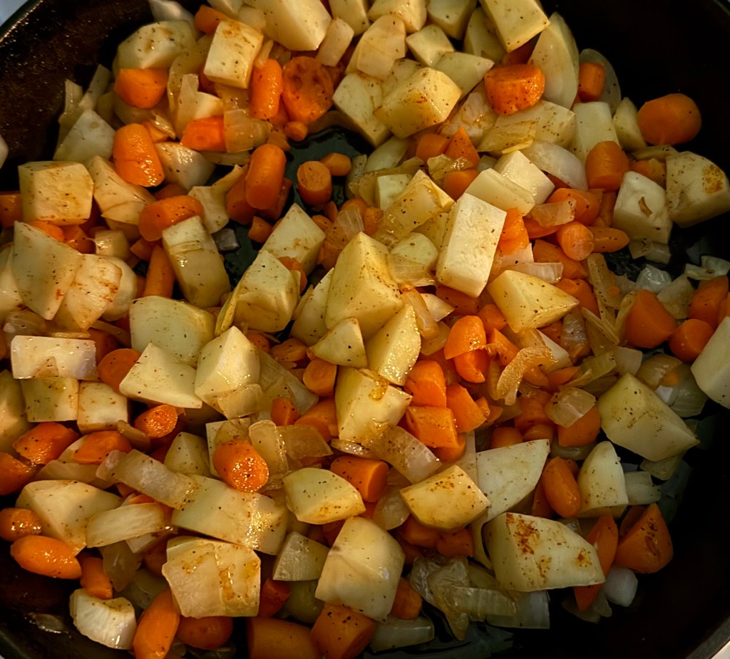3. Cook, stirring occasionally, for about 15-20 minutes, or until the potatoes and carrots are tender and golden brown. If necessary, reduce the heat to prevent burning.