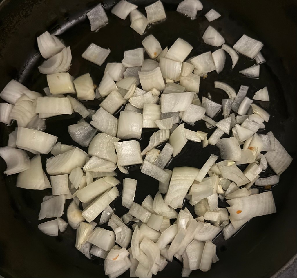 2. In a large skillet or saucepan, heat the olive oil over medium heat. Add the chopped onion and sauté until translucent, about 5 minutes.