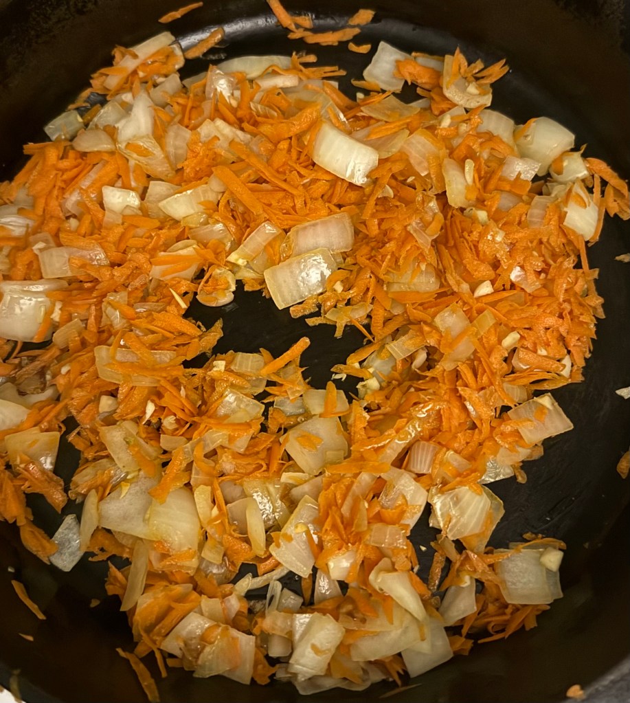3. Add the minced garlic and grated carrots, cooking for an additional 2-3 minutes until the carrots begin to soften.