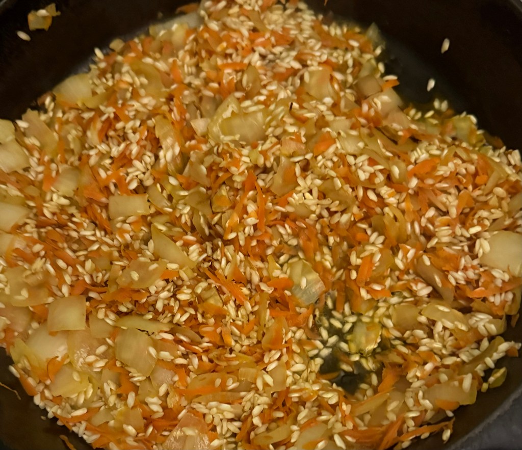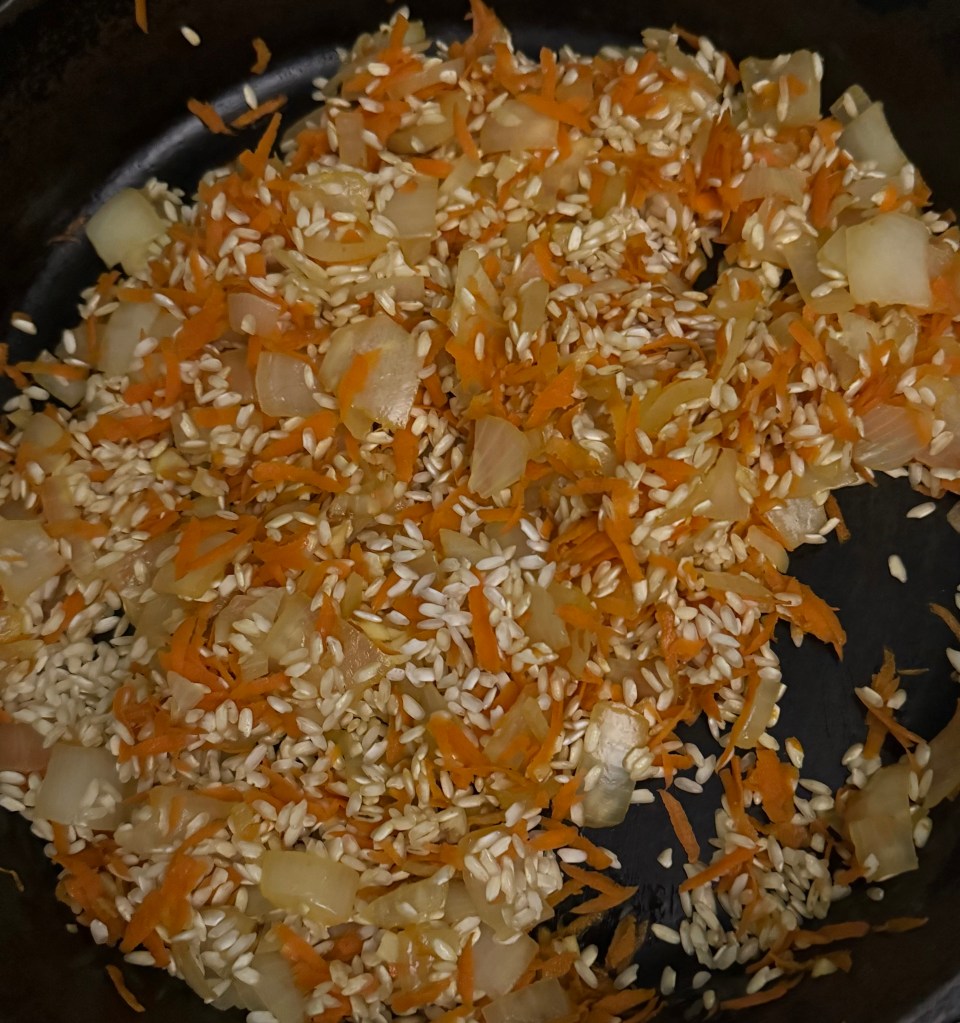 4. Stir in the Arborio rice, coating it with the oil and vegetables for about 1-2 minutes until slightly toasted.