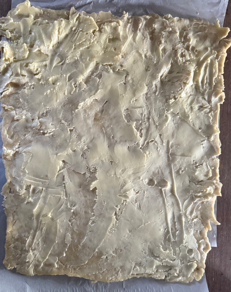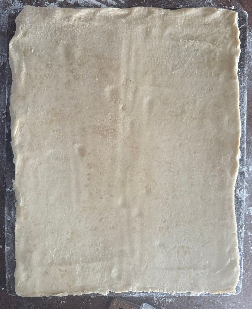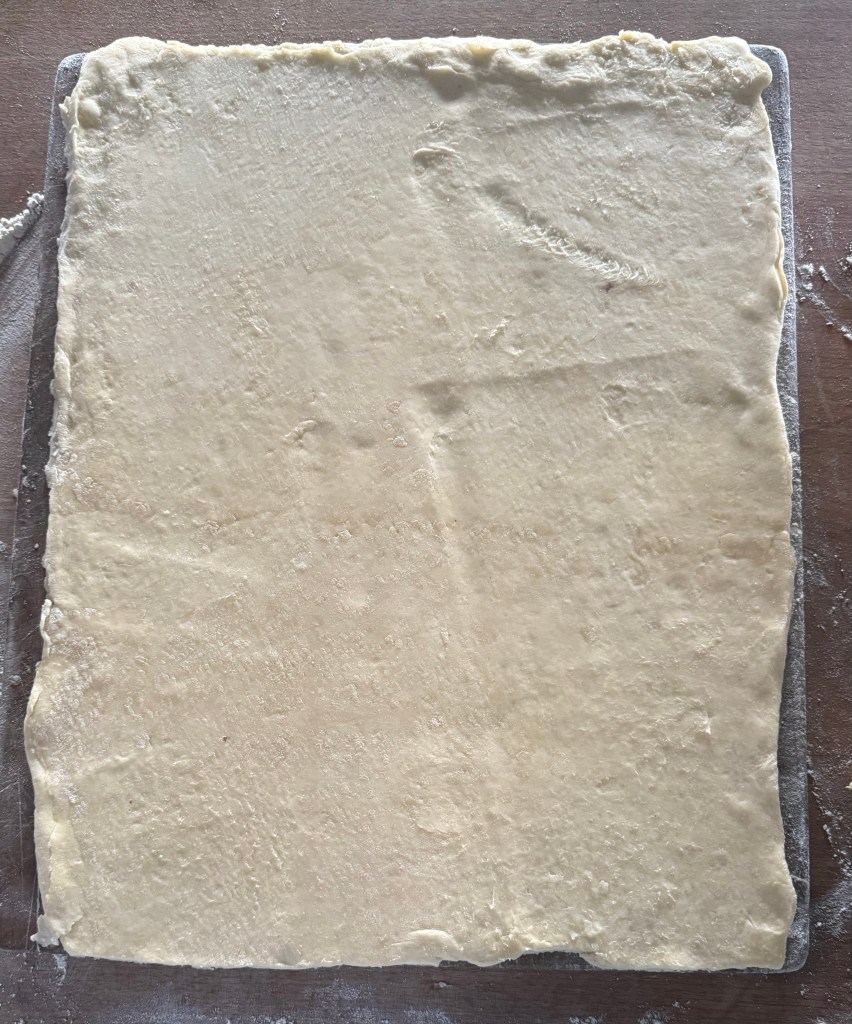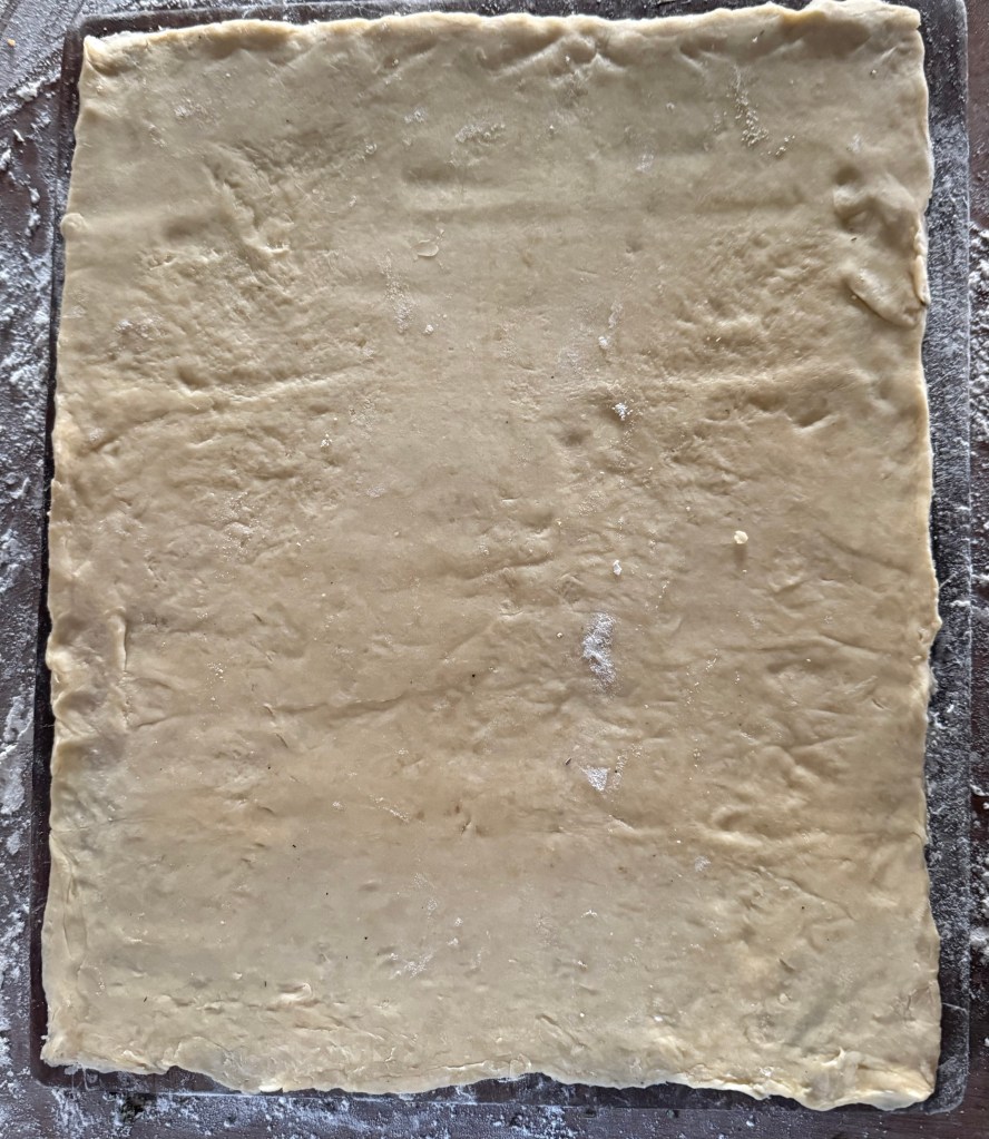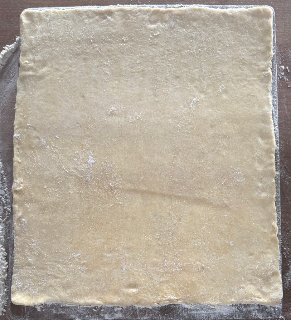 - Roll out cold puff pastry on a lightly floured surface into a large rectangleand coat with softened butter