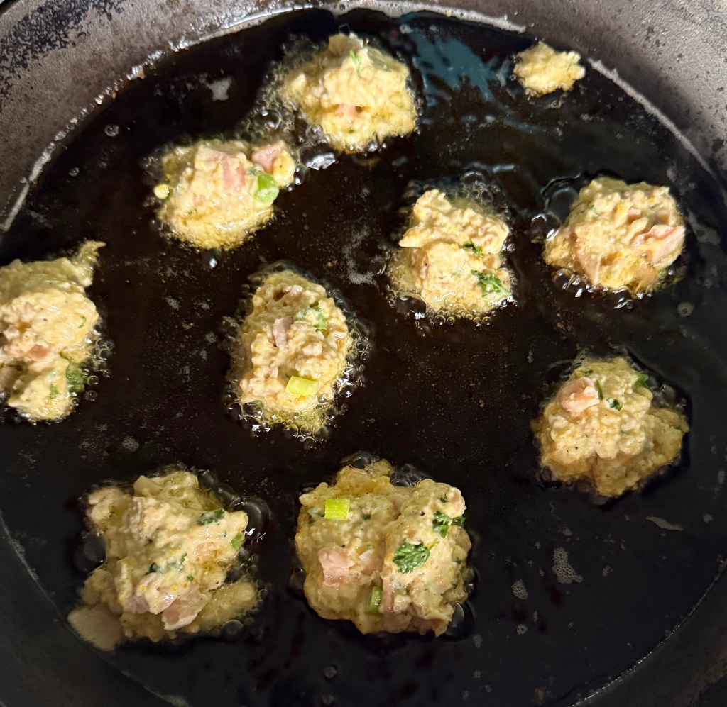 5. Once the oil is hot, drop spoonfuls of the fritter batter into the oil, flattening them slightly with the back of the spoon. Fry in batches, being careful not to overcrowd the skillet.