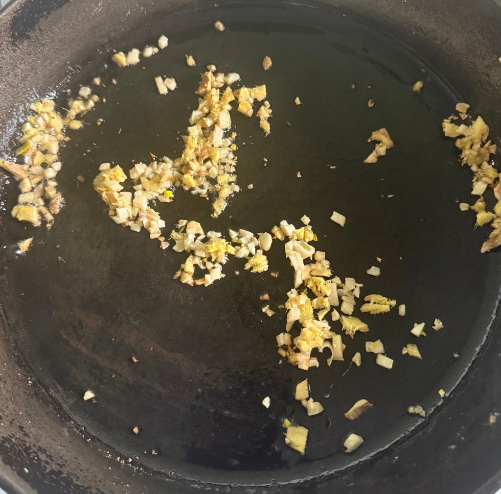 2. Add the minced garlic and grated ginger, stirring for about 30 seconds until fragrant.