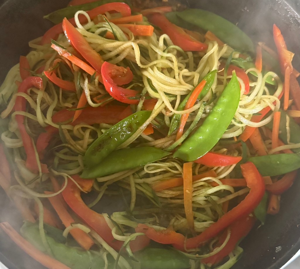 3. Add the sliced bell pepper, julienned carrot, and snap peas to the skillet. Stir-fry for about 3-4 minutes until the vegetables are tender-crisp.