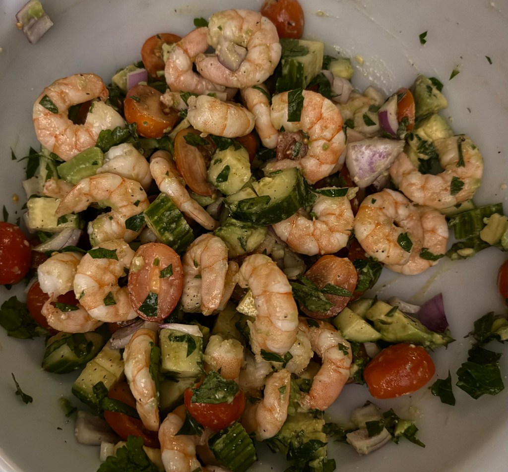 1. In a large mixing bowl, combine the cooked shrimp, diced cucumbers, cherry tomatoes, red onion, and fresh herbs. If using, add the diced avocado gently.