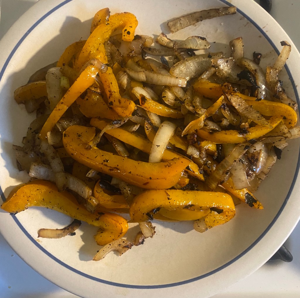 5. In the last few minutes of cooking, add the sliced bell pepper and onion to the grill to soften and char slightly.