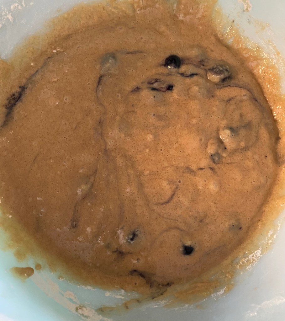 4. Pour the wet ingredients into the dry ingredients and stir until just combined; be careful not to overmix. Gently fold in the blueberries.