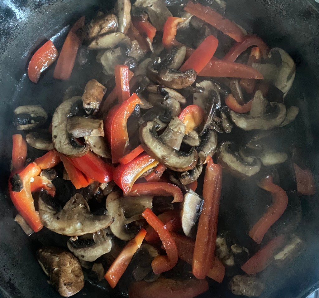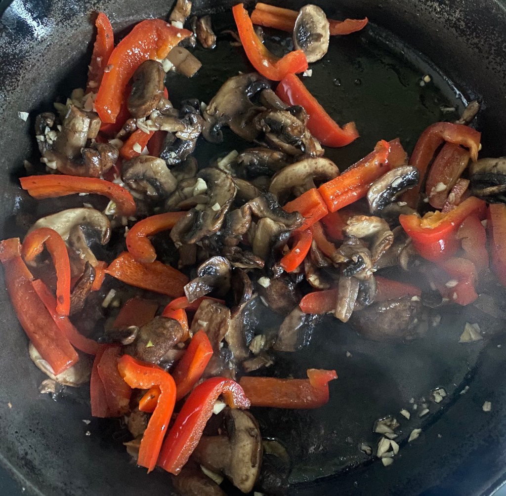 1. In a large skillet or wok, heat the olive oil or sesame oil over medium-high heat. Add the sliced mushrooms and bell pepper, stirring frequently until the vegetables are tender and the mushrooms release their moisture, about 5-7 minutes.