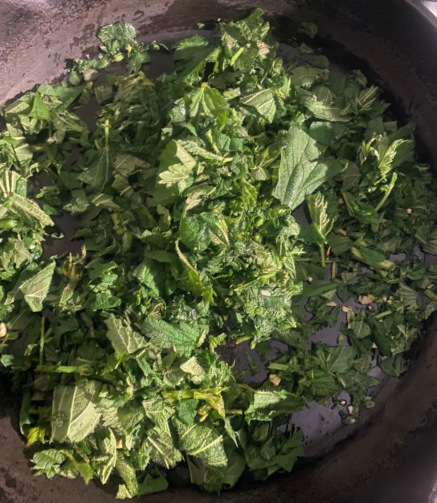 3. Add the chopped nettles to the skillet and cook until they are wilted and tender, about 3-4 minutes. Remove from heat and let cool slightly.