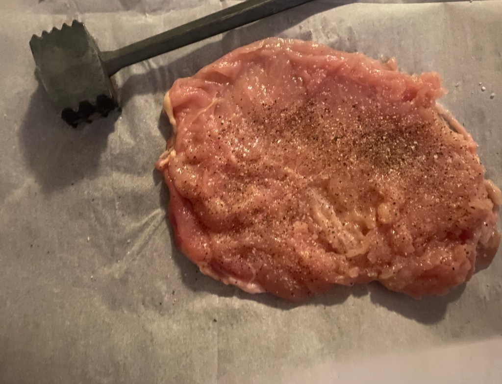 5. To prepare the chicken, place each chicken breast between two sheets of plastic wrap and gently pound them to an even thickness using a meat mallet or rolling pin.