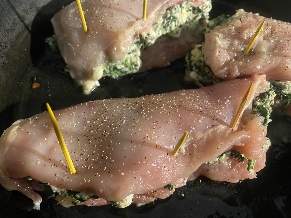 7. Secure the stuffed chicken with toothpicks or kitchen twine to hold the filling inside.
