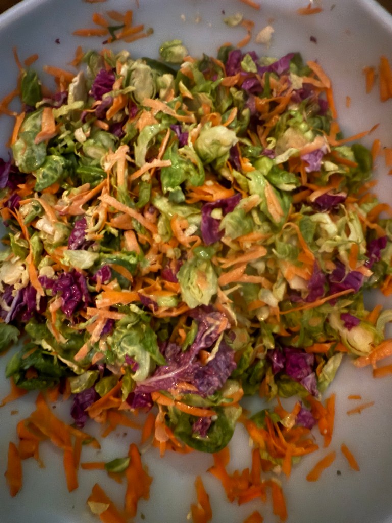 1. In a large bowl, combine the sliced Brussels sprouts, shredded carrots, red cabbage, and green onions. Toss to mix the vegetables evenly.
